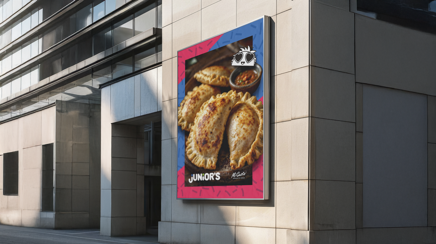 For Junior’s, we developed a fresh and accessible identity, designed to connect with a young audience without losing clarity for parents. The brand was conceived as an independent extension of Mi Gusto, with a playful and relatable tone that reinforces the idea of personal choice and enjoyment. The created character, with friendly and memorable features, became the visual core of a graphic system designed to coexist with different media: from packaging to digital communication.